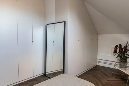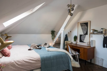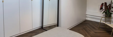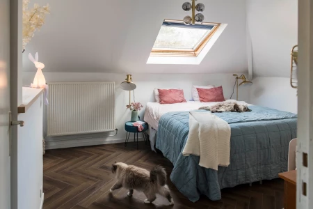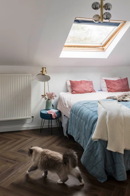 It’s all about homeliness is this bedroom. You immediately feel relaxed when you walk into this room. A herringbone pattern gives a room a luxurious touch.